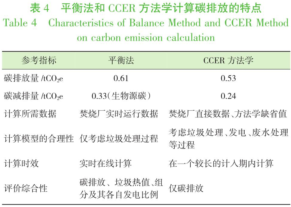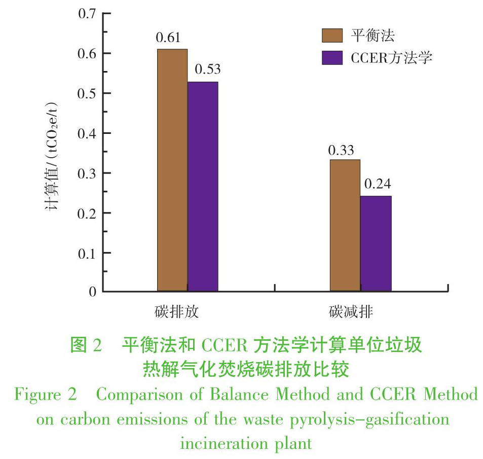 以舟山市某垃圾熱解氣化焚燒廠為例,分別采用平衡法和CCER方法學對該廠中的碳排放和碳減排量進行了對比計算。由平衡法計算得該廠單位垃圾碳排放量為0.61 tCO2e/t,其中,化石源碳燃燒產(chǎn)生的碳排放量為0.28 tCO2e/t,生物源碳碳排放為0.33 tCO2e/t(該部分可產(chǎn)生碳減排效益);CCER方法學計算所得的基準線排放量為0.53 tCO2e/t,項目排放量為0.29 tCO2e/t,項目減排量為0.24 tCO2e/t。兩種方法學的計算結(jié)果基本一致。平衡法可以對CCER方法學中項目排放量的垃圾焚燒產(chǎn)生的排放項進行補充,同時是一種簡便快捷、準確性高,價格低廉的碳排放在線分析的可行方法。但仍需對我國垃圾組分進行特定分析以完善平衡法。