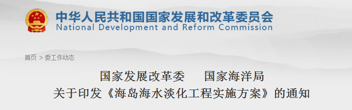 國家發(fā)展改革委 國家海洋局關(guān)于印發(fā)《海島海水淡化工程實施方案》的通知