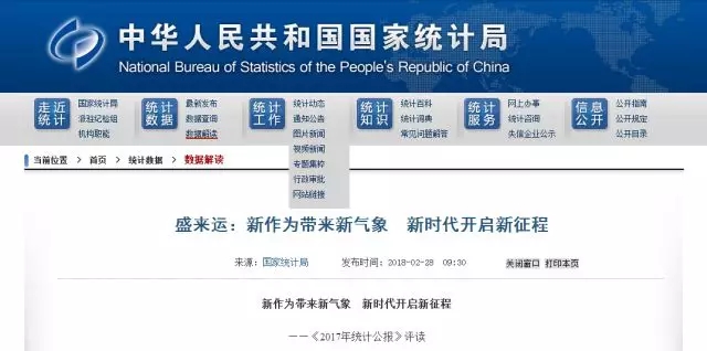 剛剛過去的2017年,是我國經(jīng)濟社會發(fā)展進程中具有里程碑意義的一年。這一年,我們黨勝利召開了十九大,確立了習近平新時代中國特色社會主義思想的歷史地位,指明了我國發(fā)展新的歷史方位,制定了堅持和發(fā)展中國特色社會主義的行動綱領(lǐng)。這一年,在以習近平同志為核心的黨中央堅強領(lǐng)導(dǎo)下,各地區(qū)各部門認真貫徹落實新理念新思想新戰(zhàn)略,堅持穩(wěn)中求進工作總基調(diào),堅持以提高發(fā)展質(zhì)量效益為中心,堅持以供給側(cè)結(jié)構(gòu)性改革為主線,砥礪奮進,攻堅克難,經(jīng)濟運行穩(wěn)中向好,好于預(yù)期,經(jīng)濟社會發(fā)展主要預(yù)期目標全面實現(xiàn),開啟了高質(zhì)量發(fā)展時代新征程。《2017年國民經(jīng)濟和社會發(fā)展統(tǒng)計公報》如期發(fā)表,筆筆數(shù)據(jù)記錄了全國各族人民拼搏奮進的累累碩果,張張圖表展示了黨的十八大以來我國發(fā)展取得的歷史性成就、發(fā)生的歷史性變革。為幫助讀者更好地理解公報的豐富內(nèi)涵,我就過去一年我國經(jīng)濟社會發(fā)展情況談一些認識和體會,與大家分享。