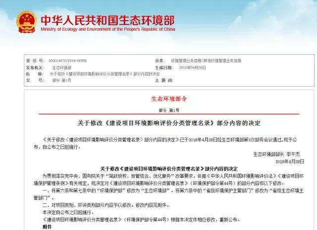 生態(tài)環(huán)境部2018年第3次部務(wù)會審議并通過了《關(guān)于修改<建設(shè)項目環(huán)境影響評價分類管理名錄>部分內(nèi)容的決定》,對《建設(shè)項目環(huán)境影響評價分類管理名錄》(環(huán)境保護(hù)部令第44號)的部分內(nèi)容予以修改,并于公布之日起實(shí)施。