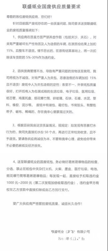 山鷹國際運營管理總經(jīng)理陳晗透露,一些回收商對回收品質(zhì)不重視,為了收入更多,經(jīng)常運用摻雜摻水的方式增加重量。這使得即使大量廢紙被順利回收,也會因二次污染造成質(zhì)量下降。