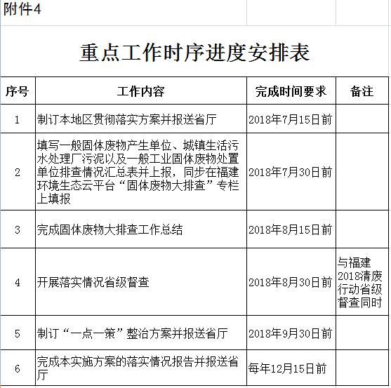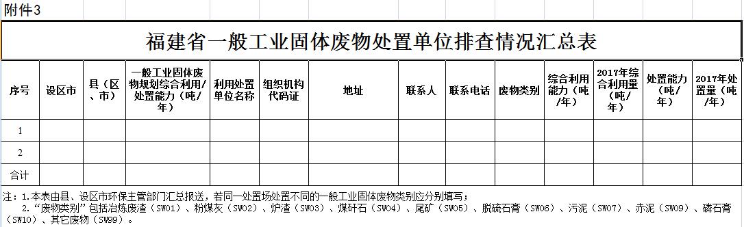 ---2018年7月30日前,市級環(huán)保部門在縣級環(huán)保部門填報的基礎上,將一般固體廢物產(chǎn)生單位、城鎮(zhèn)生活污水處理廠污泥以及一般工業(yè)固體廢物處置單位排查情況匯總表(附件1、2、3)上報省環(huán)保廳,并同步在福建環(huán)境生態(tài)云平臺“固體廢物大排查”專欄上填報。