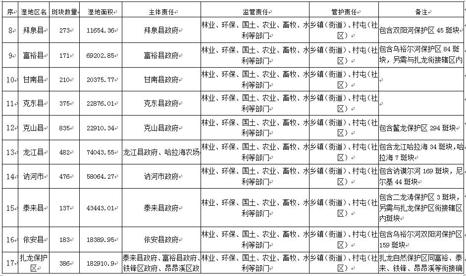 2.明確濕地斑塊管護(hù)責(zé)任。以濕地斑塊為單元,把濕地斑塊管護(hù)責(zé)任落實(shí)到鄉(xiāng)鎮(zhèn)(街道)、村屯(社區(qū)),所有濕地斑塊明確管護(hù)責(zé)任人,建立完善鄉(xiāng)鎮(zhèn)(街道)、村屯(社區(qū))管護(hù)責(zé)任機(jī)制。按照《黑龍江省濕地保護(hù)修復(fù)工作實(shí)施方案》要求,在列入名錄中的濕地的顯著位置樹(shù)立濕地標(biāo)示牌,標(biāo)明濕地面積、級(jí)別、類型、四至范圍、主管部門和管護(hù)責(zé)任人等內(nèi)容。此項(xiàng)工作2019年底前完成?!藏?zé)任單位:各縣(市)區(qū)政府、扎龍國(guó)家級(jí)自然保護(hù)區(qū)管理局、省農(nóng)墾總局九三管理局〕