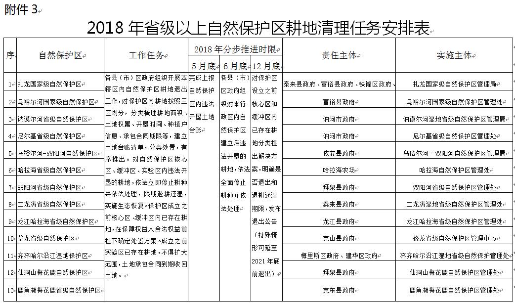 2.大力開(kāi)展自然保護(hù)區(qū)內(nèi)毀濕開(kāi)墾問(wèn)題整改。認(rèn)真貫徹落實(shí)省林業(yè)廳《黑龍江省地方林業(yè)自然保護(hù)區(qū)內(nèi)毀濕(林、草)開(kāi)墾問(wèn)題整改工作方案》要求,組織開(kāi)展本轄區(qū)內(nèi)自然保護(hù)區(qū)耕地退出工作,對(duì)保護(hù)區(qū)內(nèi)耕地按照三區(qū)劃分,分類梳理耕地面積、土地權(quán)屬、開(kāi)墾時(shí)間、種植戶信息、承包合同期限等,建立土地臺(tái)賬清單,完成保護(hù)區(qū)內(nèi)耕地退出基礎(chǔ)工作。對(duì)自然保護(hù)區(qū)成立前核心區(qū)和緩沖區(qū)內(nèi)已存在的耕地分類提出解決方案,明確退耕還濕期限,依法依規(guī)做好保護(hù)區(qū)內(nèi)耕地有序退出工作。對(duì)自然保護(hù)區(qū)成立后發(fā)生的違法、違規(guī)毀濕(林、草)開(kāi)墾問(wèn)題,全面停止耕種并依法打擊處理。此項(xiàng)工作2018年底前完成。(責(zé)任單位:訥河市政府、龍江縣政府、富??h政府、泰來(lái)縣政府、拜泉縣政府、克山縣政府、克東縣政府、依安縣政府、甘南縣政府、昂昂溪區(qū)政府、梅里斯區(qū)政府、鐵鋒區(qū)政府、建華區(qū)政府、扎龍國(guó)家級(jí)自然保護(hù)區(qū)管理局、省農(nóng)墾總局九三管理局)