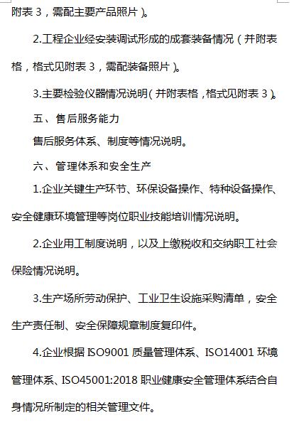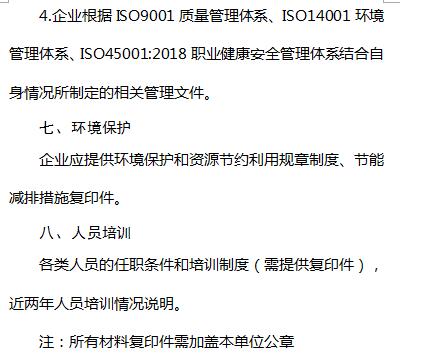 (十四)企業(yè)應具備ISO9001質量管理體系、ISO14001環(huán)境管理體系、ISO45001:2018職業(yè)健康安全管理體系,結合企業(yè)經營生產和產品使用要求等方面的實際情況,建立相應的管理體系。