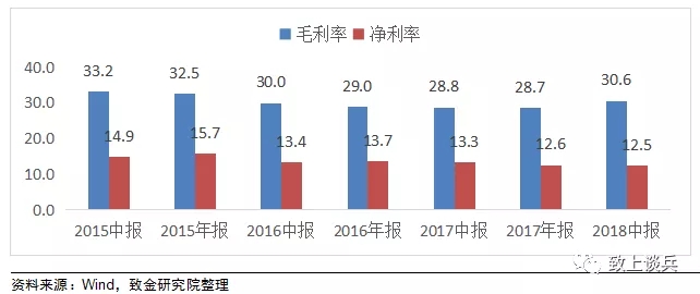2018年上半年板塊整體毛利率30.6%,同比上漲1.8個(gè)百分比,凈利率12.5%,同比下降0.7個(gè)百分比,盈利水平略有下降,變化較小。