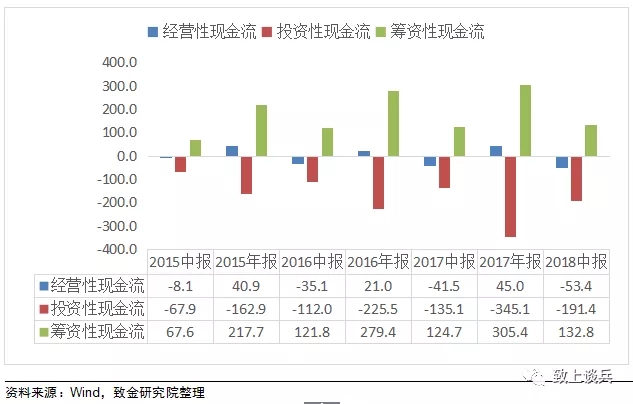 現(xiàn)金流方面,2018年上半年行業(yè)整體經(jīng)營性現(xiàn)金流為-53億元,較上年同期大幅減少12億元;籌資性凈現(xiàn)金流132億元,較去年同期增長8億元;上半年投資性凈現(xiàn)金流為-191億元,經(jīng)營與籌資凈現(xiàn)金流量難以彌補(bǔ)投資凈現(xiàn)金流出,并呈現(xiàn)出逐年惡化的趨勢(shì),行業(yè)整體現(xiàn)金流情況依然堪憂。