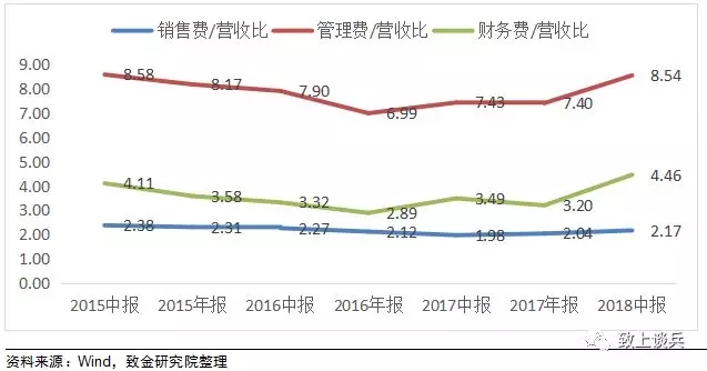期間費(fèi)用率方面,2018年上半年整體銷售費(fèi)用率同比小幅上漲至2.17%,管理費(fèi)用率同比大幅上漲至8.54%,財(cái)務(wù)費(fèi)用率同比上漲至4.46%,管理費(fèi)率和財(cái)務(wù)費(fèi)率均漲至較高位。