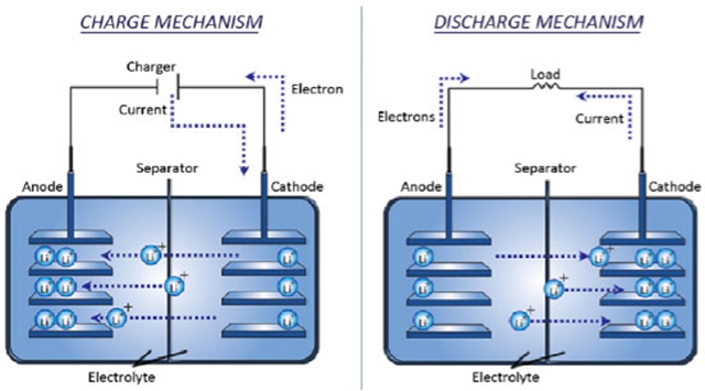 注:Charge mechanism -充電機(jī)理;discharge mechanism -放電機(jī)理;charger -充電器;load -負(fù)載;electrons -電子;current -電流;electrolyte -電解質(zhì);anode -陽極(電池放電時為負(fù)極);cathode -陰極(電池放電時為正極);separator -隔膜