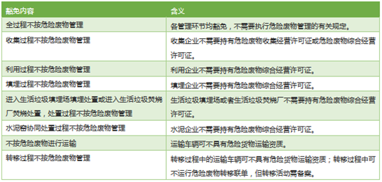 注:上表依據(jù)《危險廢物豁免管理清單》及《環(huán)境資源犯罪實務(wù)精釋》(喻海松著,2017年1月版,法律出版社,P136~137)編輯、整理