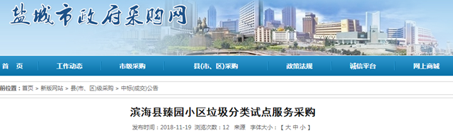 江蘇省鹽城市濱海縣臻園小區(qū)垃圾分類試點服務采購項目發(fā)布中標公示,中國天楹股份有限公司成為中標的社會資本方,中標金額為315800.00元,服務期限為365日歷天。