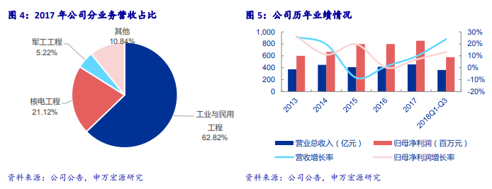 核電建設(shè)行業(yè)絕對(duì)龍頭,業(yè)績(jī)穩(wěn)健,積極擴(kuò)張民用與工業(yè)領(lǐng)域。公司是中國(guó)核建集團(tuán)旗下核電工程商,實(shí)際控制人為國(guó)資委。截至目前公司承建我國(guó)絕大多數(shù)核電站的核島工程,系我國(guó)核電建設(shè)領(lǐng)域領(lǐng)軍企業(yè),在國(guó)內(nèi)核電工程市場(chǎng)長(zhǎng)期占據(jù)絕對(duì)主導(dǎo)地位。近年來(lái)公司依托技術(shù)優(yōu)勢(shì),積極拓展工業(yè)與民用工程,2017 年工業(yè)與民用業(yè)務(wù)貢獻(xiàn) 55.96%的毛利,較 2011 年增長(zhǎng) 16.11 個(gè)百分點(diǎn)。公司整體業(yè)績(jī)穩(wěn)健,2012-2017 年歸母凈利潤(rùn)復(fù)合增速達(dá) 12.38%。2016 年公司順利登陸 A 股,募資加碼建設(shè)核電工程。截至 2017 年底,公司在國(guó)內(nèi)已建成核電機(jī)組 39 臺(tái),在建 19 臺(tái);在國(guó)外已建成核電機(jī)組 4 臺(tái),在建 2 臺(tái)。