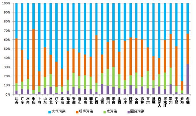 從各省污染類型占比來看,北京、上海、青海的大氣污染舉報(bào)占比超過七成,比全國平均水平高出10個(gè)百分點(diǎn);重慶、廣西噪聲污染占比超過五成,高出全國平均水平15個(gè)百分點(diǎn),夜間施工噪聲擾民問題突出。