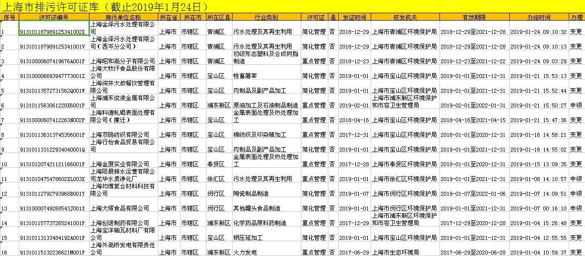 近日,上海市生態(tài)環(huán)境局發(fā)布了上海市排污許可證庫(截止2019年1月24日),匯總了475家具有排污許可證的企業(yè),詳情如下:
