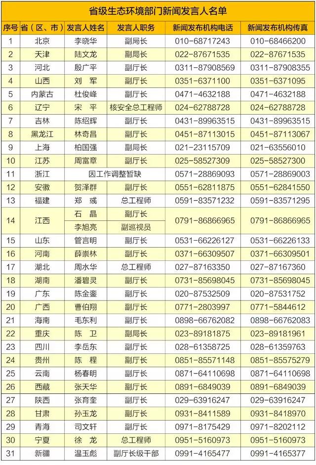 2019年1月21日,生態(tài)環(huán)境部更新發(fā)布31個省級生態(tài)環(huán)境部門新聞發(fā)言人名單,這是生態(tài)環(huán)境部第二次發(fā)布省級生態(tài)環(huán)境部門新聞發(fā)言人名單。生態(tài)環(huán)境部有關負責人表示,推進例行新聞發(fā)布工作,保障公眾知情權是生態(tài)環(huán)境部堅定不移、常抓不懈的一項重要工作。2017年,生態(tài)環(huán)境部印發(fā)《關于進一步加強環(huán)境信息發(fā)布工作...