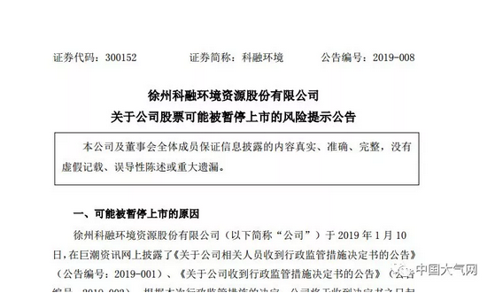 徐州科融環(huán)境資源股份有限公司1月17日發(fā)布公告稱,科融環(huán)境股票可能面臨被暫停上市的風險??迫诃h(huán)境于2019年1月10日,在巨潮資訊網(wǎng)上披露了《關于公司相關人員收到行政監(jiān)管措施決定書的公告》(公告編號:2019-001)、《關于公司收到行政監(jiān)管措施決定書的公告》(公告編號:2019-002)。根據(jù)本次...