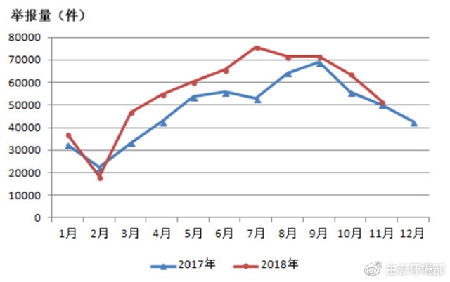 2018年1-11月全國總舉報量為657702件,11月全國環(huán)保舉報管理平臺共接到環(huán)保舉報51724件。其中“12369”環(huán)保舉報熱線電話共24998件,微信舉報20227件,網(wǎng)上舉報6499件。 一、秋冬季舉報持續(xù)下降 2018年11月,全國環(huán)保舉報管理平臺(以下簡稱&ld...