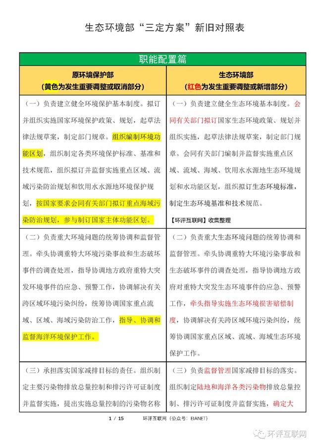 近日,生態(tài)環(huán)境部“三定方案”已經(jīng)印發(fā),在重新整合了部門的職責(zé)之外,還增設(shè)了新的職能及崗位。為方便大家更好地理解生態(tài)環(huán)境部前后職能配置、內(nèi)設(shè)機構(gòu)和人員編制的變化,環(huán)環(huán)整理編輯發(fā)布新舊“三定方案”對照表,以供參考。特別說明:生態(tài)環(huán)境部“三定方案”以官網(wǎng)最終發(fā)布版本為準。01職能變化1. 新增“中央生態(tài)環(huán)...
