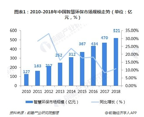 在“十三五”的環(huán)保政策熱潮以及ICT技術(shù)成熟背景下,我國智慧環(huán)保行業(yè)發(fā)展迅速,據(jù)測算,2018年行業(yè)規(guī)模為521億元,同比增長10.91%,2010-2018年行業(yè)復(fù)合增速達到19.31%。 一、市場規(guī)模:政策熱潮和技術(shù)發(fā)展雙催動,智慧環(huán)保市場增長空間大 “十三五...
