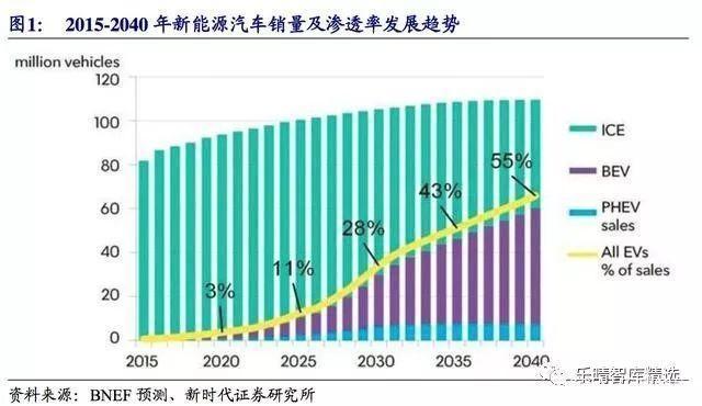 新能源汽車發(fā)展空間巨大,隨著新能源汽車性能提升以及痛點(diǎn)的改善,新能源汽車帶來的沖擊越來越大,滲透率隨之提升。 根據(jù)BNEF預(yù)測,到2025年全球新能源汽車的銷量將達(dá)到1100萬輛,滲透率達(dá)到11%,同年燃油汽車銷量將達(dá)到拐點(diǎn),步入下行趨勢;到2030年全球銷量將繼續(xù)攀升至3000萬輛,滲透率達(dá)到28...