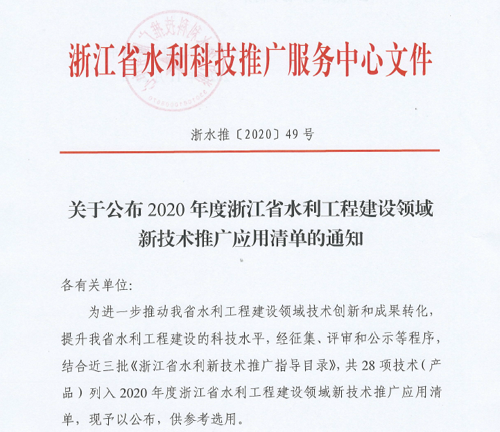 2020年11月26日,浙江省水利科技推廣服務中心公開發(fā)布《關于公布2020年度浙江省水利工程建設領域新技術(shù)推廣應用清單的通知》。通知顯示: 為進一步推動浙江省水利工程建設領域技術(shù)創(chuàng)新和成果轉(zhuǎn)化,提升水利工程建設的科技水平,經(jīng)征集、評審和公示等程序,結(jié)合近三批《浙江省水利新技術(shù)推廣指導目錄》,由浙江...
