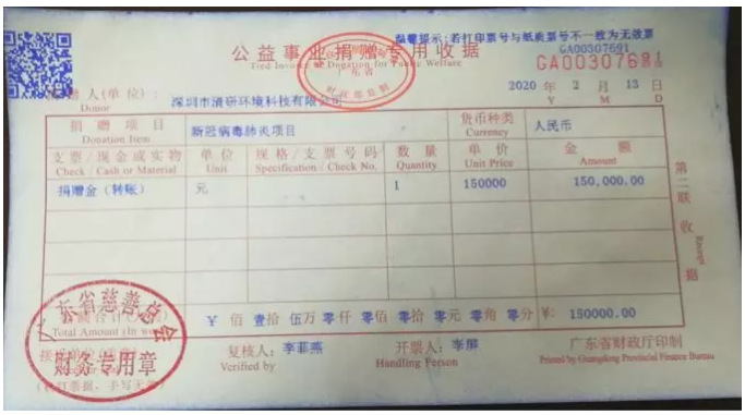 為表達(dá)對(duì)前線抗疫戰(zhàn)士的敬意和支持,2020年2月13日,深圳市清研環(huán)境科技有限公司向廣東省慈善基金會(huì)捐助現(xiàn)金15萬(wàn)元。同時(shí),清研環(huán)境骨干員工組成的“戰(zhàn)狼團(tuán)隊(duì)”也自發(fā)捐助3.25萬(wàn)元用于為抗疫戰(zhàn)士購(gòu)買愛(ài)心物資,其中第一批愛(ài)心物資已于當(dāng)天交給支援武漢的廣東醫(yī)療隊(duì)醫(yī)護(hù)人員。廣東省慈...