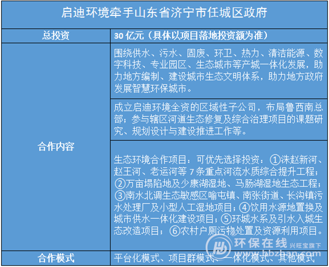 近日,啟迪環(huán)境公告稱公司與山東省濟寧市任城區(qū)政府簽署合作框架協(xié)議,雙方將對生態(tài)體系建設(shè)重點項目進行合作,包括河流水質(zhì)綜合提升工程、濕地生態(tài)工程、飲用水源地置換及城市供水一體化建設(shè)項目等6個生態(tài)環(huán)境項目,預(yù)計總投資約30億元。具體如下圖: 任城區(qū)是山東濟寧市的核心區(qū),能源富集,產(chǎn)業(yè)發(fā)達,目前正籌備構(gòu)建...