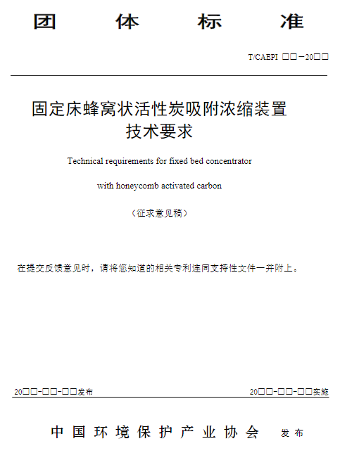 各有關(guān)單位: 為促進(jìn)固定床蜂窩狀活性炭吸附技術(shù)發(fā)展,規(guī)范固定床蜂窩狀活性炭吸附濃縮裝置的制造使用,我會(huì)下達(dá)編制中國環(huán)境保護(hù)產(chǎn)業(yè)協(xié)會(huì)標(biāo)準(zhǔn)《固定床蜂窩狀活性炭吸附濃縮裝置技術(shù)要求》。目前,標(biāo)準(zhǔn)編制單位已完成標(biāo)準(zhǔn)的征求意見稿。根據(jù)《中國環(huán)境保護(hù)產(chǎn)業(yè)協(xié)會(huì)標(biāo)準(zhǔn)管理辦法》的規(guī)定,現(xiàn)將該標(biāo)準(zhǔn)征求意見稿和有關(guān)材料印...