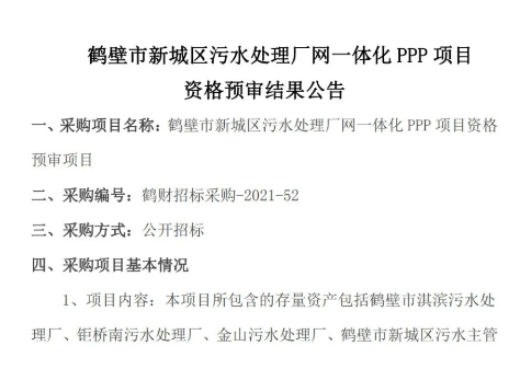 固始縣污水處理設(shè)施PPP項目社會資本方采購 資格預(yù)審公告 項目概況 固始縣污水處理設(shè)施PPP項目招標項目的潛在資格預(yù)審申請人應(yīng)在凡有意參加投標者,憑CA數(shù)字證書登錄《全國公共資源交易平臺(河南省固始縣)》會員系統(tǒng)進行網(wǎng)上報名并下載資格預(yù)審文件;領(lǐng)取資格預(yù)審文件,并于2021年11月19日08時30分...